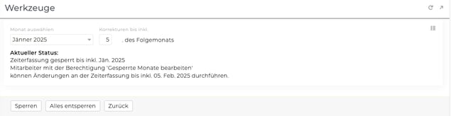 Mit diesem Werkzeug kann die Zeiterfassung bis zu einem bestimmten Monat gesperrt werden. In gesperrten Monaten können User keine Leistungen und Anwesenheit mehr erfassen. User mit der Berechtigung "Gesperrte Monate bearbeiten" können bis zum angegebenen Tag des Folgemonats Änderungen durchführen.