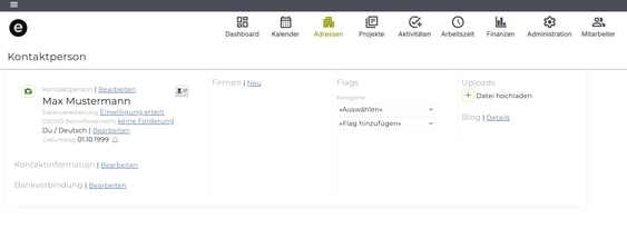 - Nach dem Speichern öffnet sich die Maske der Kontaktperson. Dort können weitere Informationen zum Kontakt ergänzt werden, z. B. Flags, Bankverbindung, Kontaktinformationen, Firmen und vieles mehr.