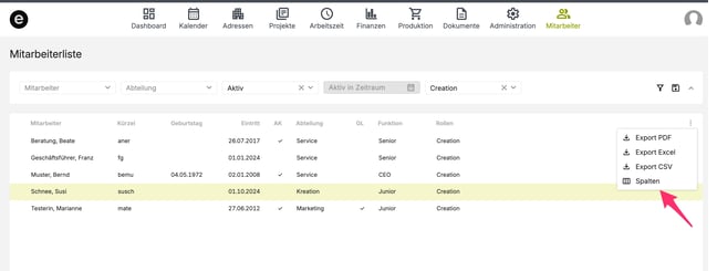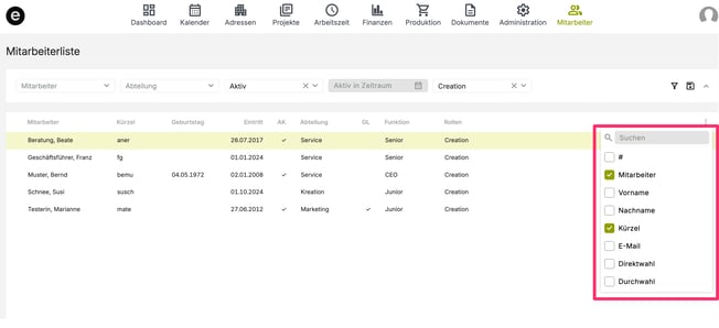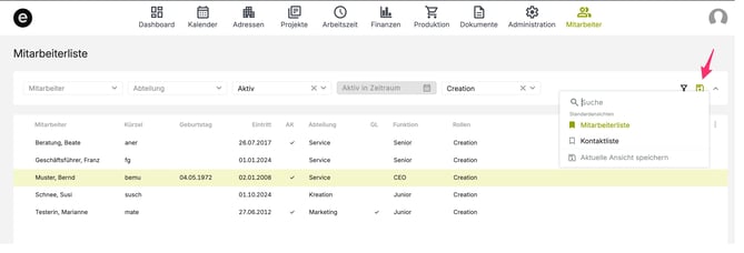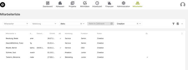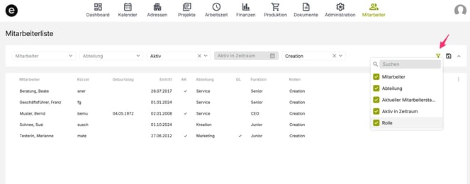 Filtern in der Mitarbeiterliste