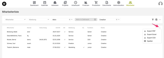 In der ersten Zeile der Liste findest du rechts ein Drei-Punkte-Menü (⋯). Darüber erreichst du die Spaltenauswahl sowie die Exportfunktionen.