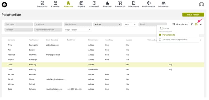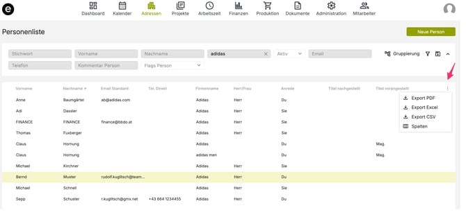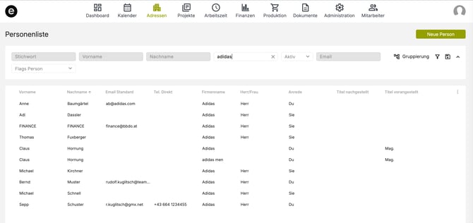 Die Personenliste findest du direkt im Modul Adressen. Dort werden alle angelegten Personen in einer strukturierten Listenansicht angezeigt.