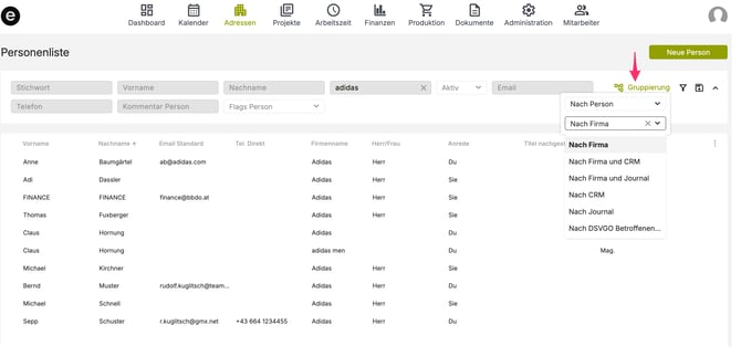 Du kannst die Personenliste nach verschiedenen Kriterien gruppieren. Folgende Gruppierungen stehen zur Verfügung: